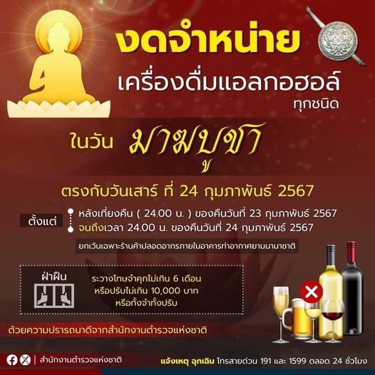 สำนักงานตำรวจแห่งชาติเตือนงดจำหน่ายเครื่องดื่มแอลกอฮอล์ เนื่องในวันมาฆบูชา ประจำปี 2567 ทุกช่องทาง “