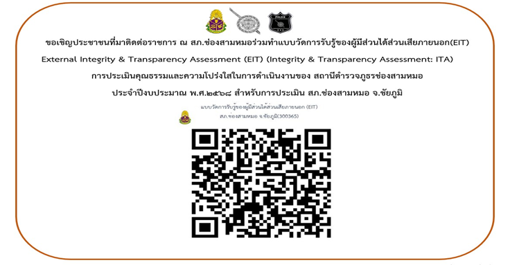 สภ.ช่องสามหมอ เชิญชวนร่วมทำแบบวัดการรับรู้ของผู้มีส่วนได้ส่วนเสียภายนอก (EIT) การประเมินคุณธรรมและความโปร่งใสในการดำเนิน งานของสถานีตำรวจ ประจำปีงบประมาณ 2568
